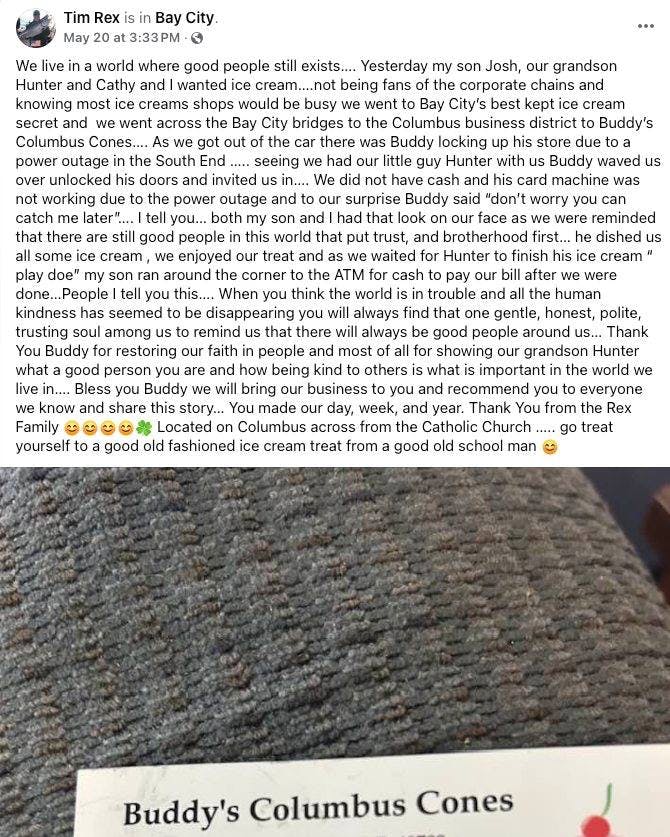“I don’t read what people say on the internet, but when somebody showed me that post and all the nice things people were saying about me, it made me so happy I cried! I mean, what are you supposed to do? I was locking up and my card machine wasn’t working—and a kid looks up at you and wants an ice cream cone? The next decision is about what your priorities are, and mine are kids.